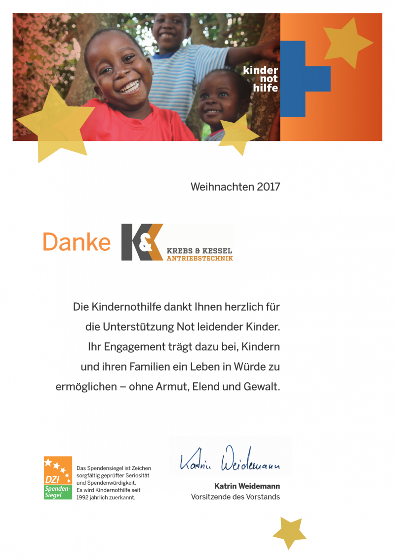 Auch in diesem Jahr haben wir uns entschieden anstelle von Weihnachtsgeschenken die Kindernothilfe mit einer Spende zu bedenken. Wir freuen uns auf diesem Wege einen kleinen Beitrag für Kinder in Not zu leisten.