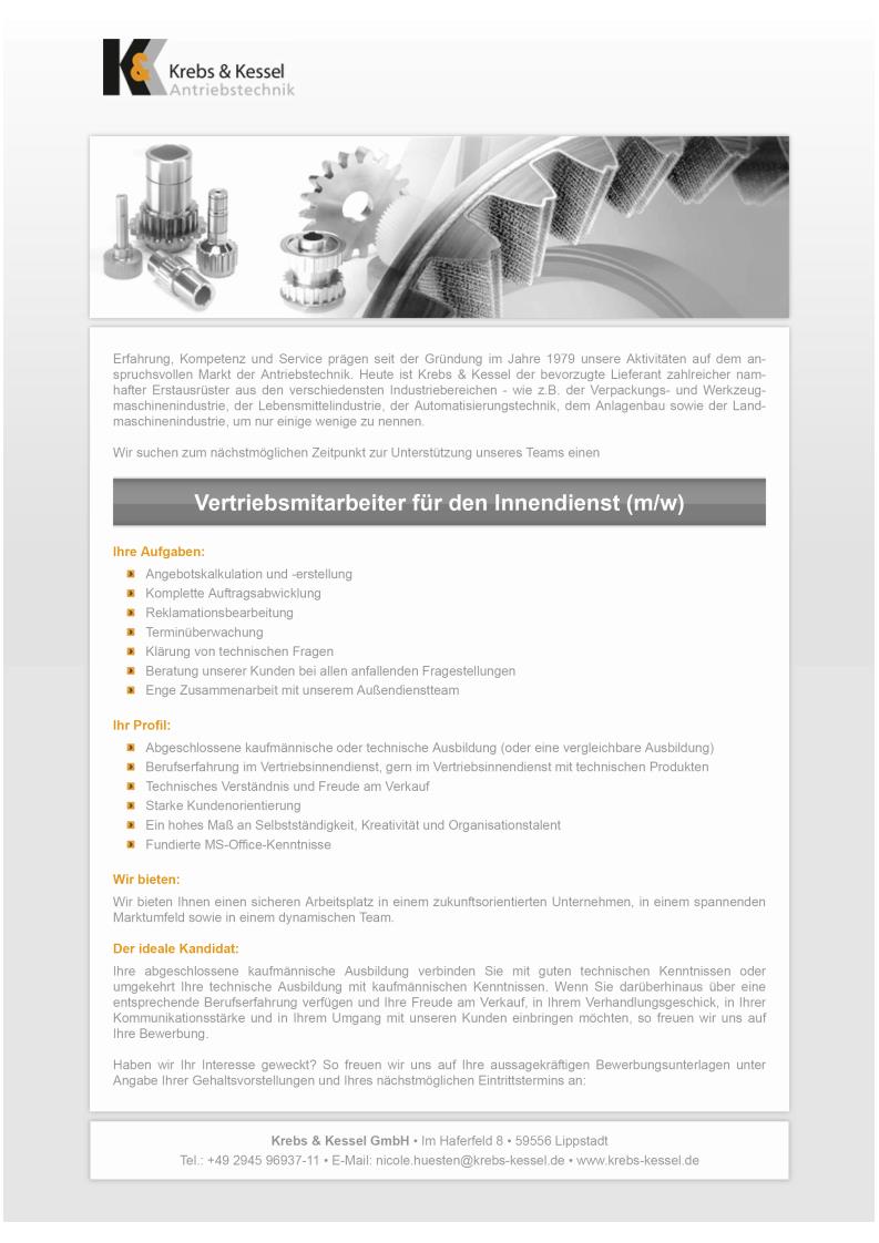 Ihre abgeschlossene kaufmännische Ausbildung verbinden Sie mit guten technischen Kenntnissen oder umgekehrt Ihre technische Ausbildung mit kaufmännischen Kenntnissen. Wenn Sie darüberhinaus über eine entsprechende Berufserfahrung verfügen und Ihre Freude am Verkauf, in Ihrem Verhandlungsgeschick, in Ihrer Kommunikationsstärke und in Ihrem Umgang mit unseren Kunden einbringen möchten, so freuen wir uns auf Ihre Bewerbung.