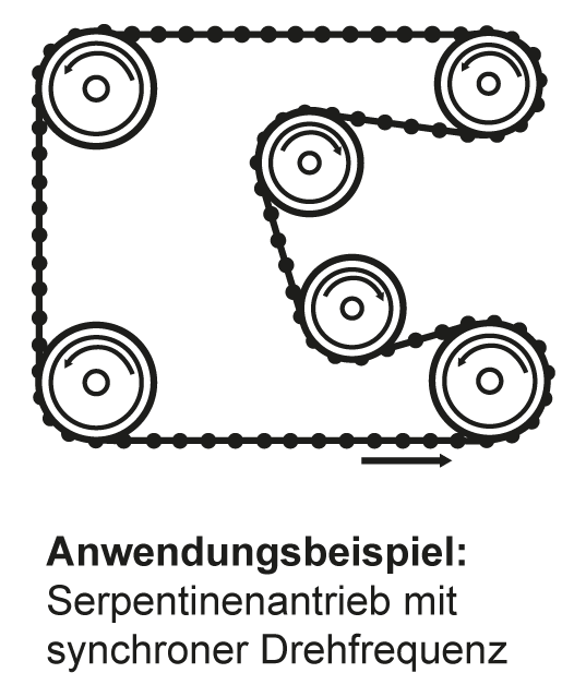 - großes Zahnvolumen und 50 % mehr Zähne im Eingriff als der vergleichbare Normzahnriemen